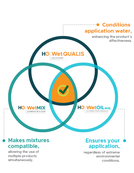 HO-WetMIX is a highly biodegradable builder. It acts as a compatibilizing agent for tank mixes, favoring the formation of stable solutions, as well as the recovery of mixes.